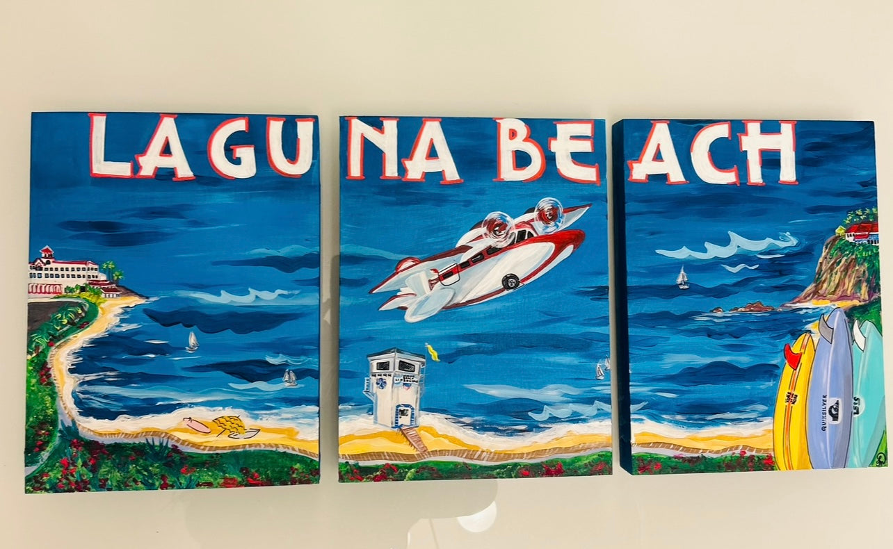 This all original, 3-piece of acrylic on wood and covered in resin, so perfect for locals and tourists alike! It captures some of the most iconic spots on Laguna: Las Brisas, the gazebo, lifeguard tower, Hotel Laguna, as well as surfboards front right with local big surf brands native to Laguna. Each 9”x12” piece is carefully crafted and wired on the back. Get it while you can- supply limited!