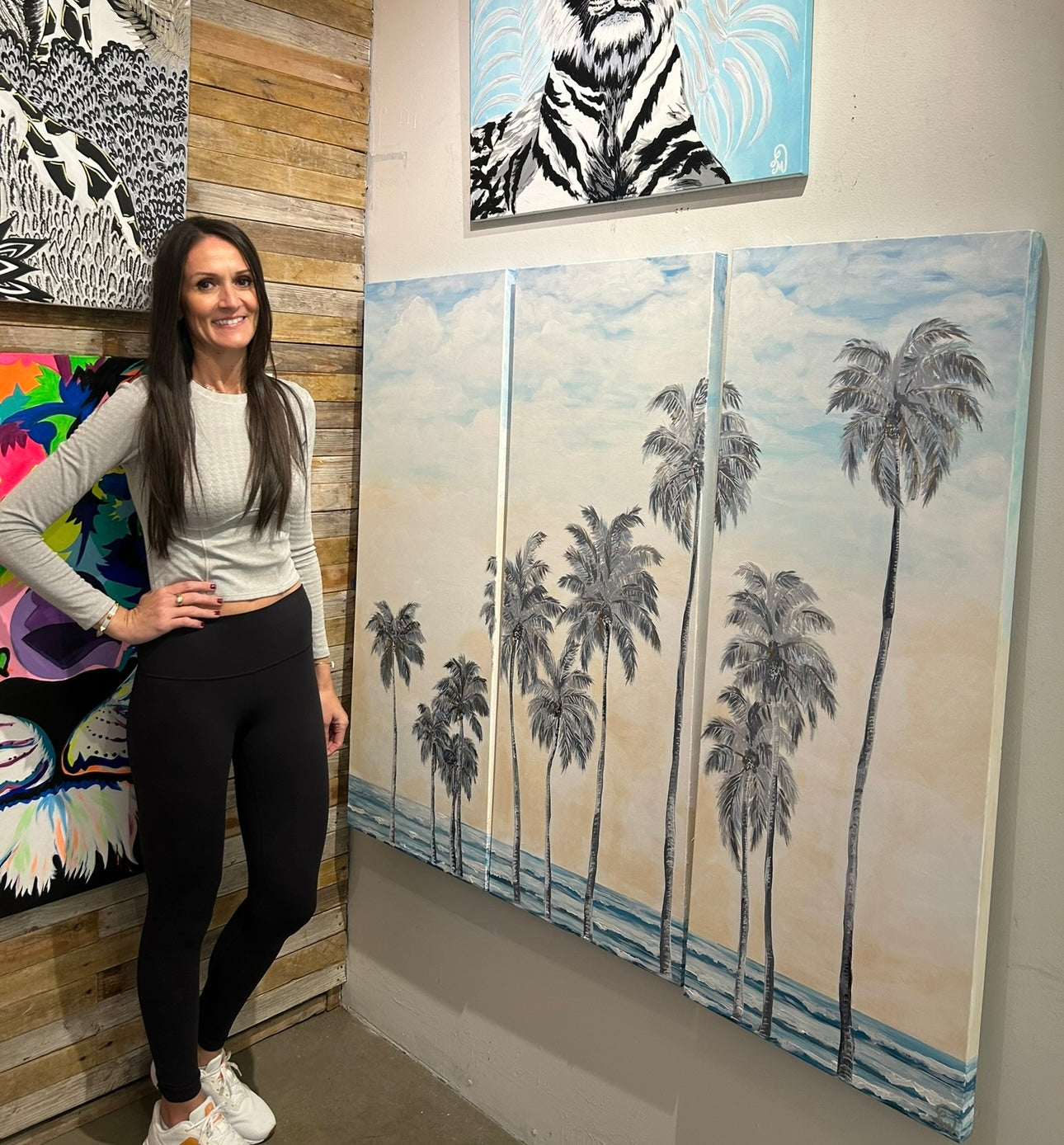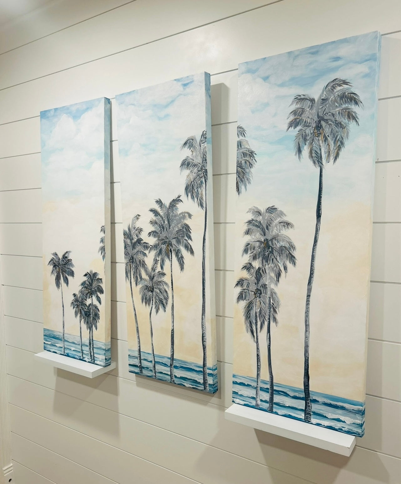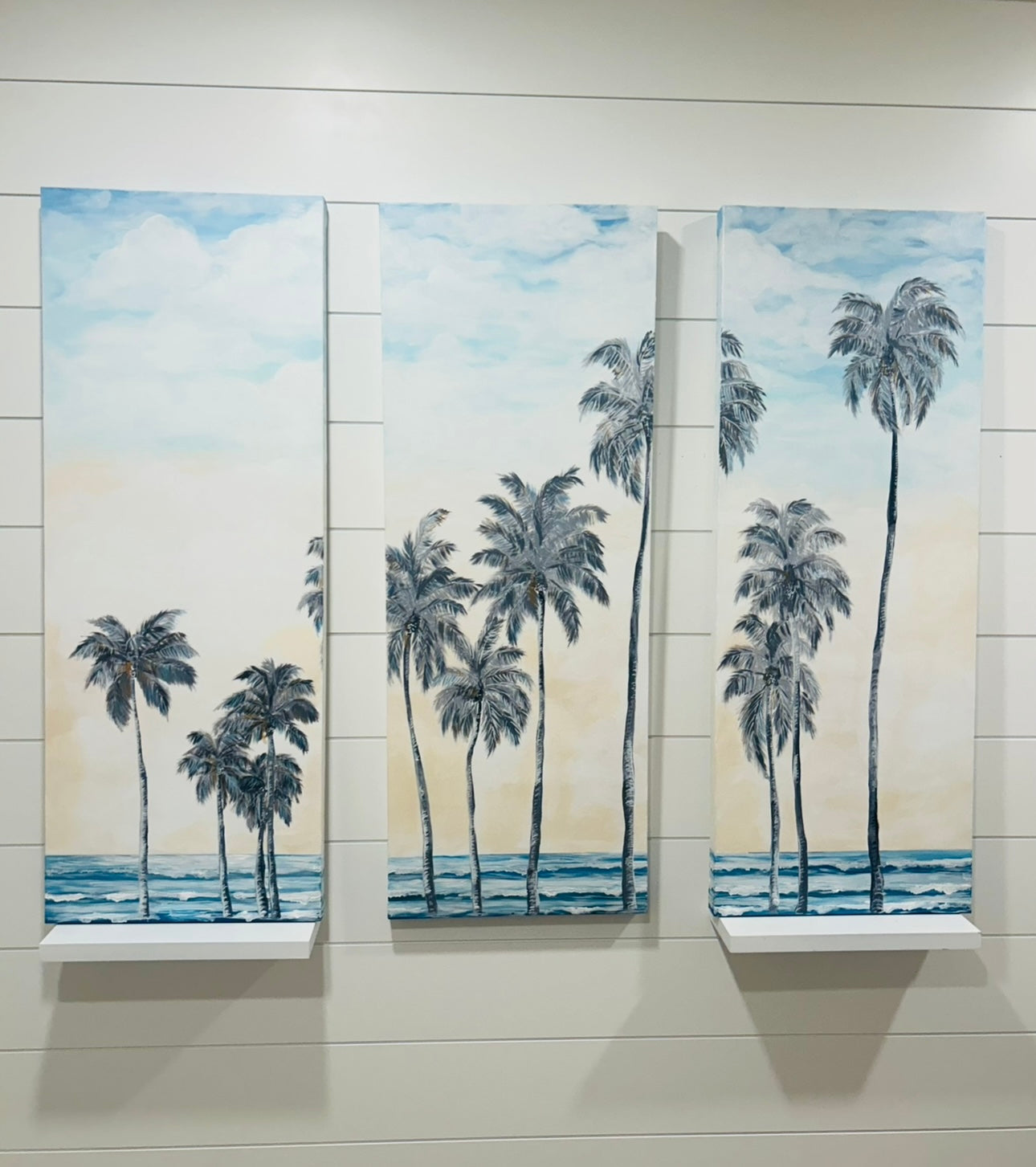 These triptychs of palms and the horizon against a soft warm vanilla sky are sure to bring tranquility and beauty to any room. Each 18”x48” piece is all original acrylic on gallery level canvas. Place them together or space them apart- they will add a glow to wherever they go!